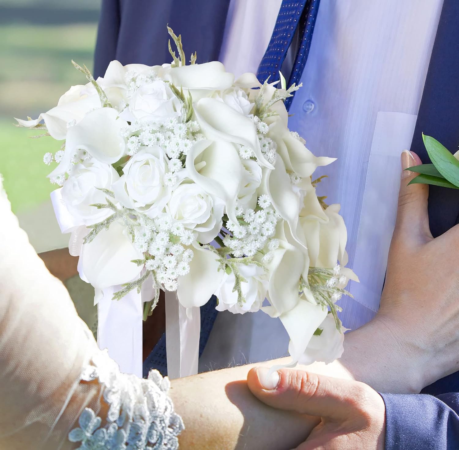 • Handcrafted with lifelike white calla lilies, silk roses, and artificial baby’s breath