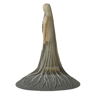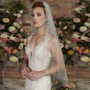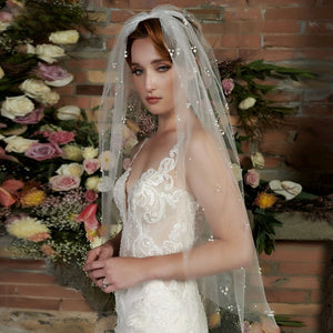 Drapes gracefully for romantic updos or cascades softly over loose curls. Pair with floral crowns, tiaras, or leave minimalist for understated charm. -