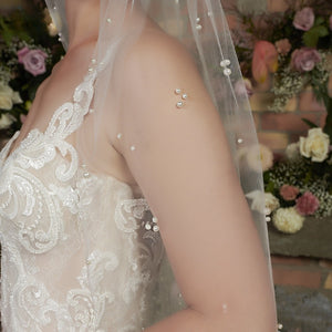 - Material: Delicate tulle with hand-scattered pearls for ethereal shimmer.