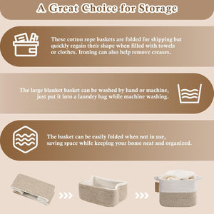 - Soft Material. The decorative basket is made of cotton rope with a soft touch, which is perfect for home use, especially for toddlers, babies, children, and pets. It's a smart choice for organizing clothes, toys, stuffed animals, blankets, and even throwing pillows