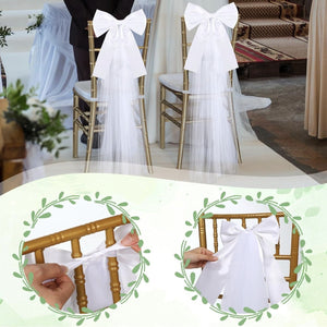 Wedding Ceremony Church Aisle Chair Decor: White Satin Bow with Tulle (15.7, Pack of 4)